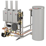 The water heater(s) shall be Rheem Tankpak Series 4 Deluxe model no. __ with an hourly input of __ MJ and an hourly recovery rate of ___ litres through 50°C rise. The water heater(s) shall conform to AS/NZS5263.1.2. The water heater shall operate on the top down heating principle. The water heater shall have electronic staging and rotation for models with more than two continuous flow units to reduce energy consumption. The water heater shall have high level BMS and remote monitoring capabilities. [for duty/standby primary pump option] The water heater shall be provided with two primary pumps operating in duty/standby and auto changeover if pump is in fault. [for duty/standby secondary pump option] The water heater shall be provided with factory integrated duty/standby UPM series secondary pumps with auto changeover if pump is in fault. The water heater shall be supplied with 3 temperature sensors to monitor tank, building flow and building return and if secondary pumps are integrated, control the pumps via the return sensor to reduce energy consumption. The water heaters shall be factory assembled and tested and include master controller with digital display housed in an IP54 enclosure. The frame shall be hot dip galvanised and third party certified for wind loadings up to 74.87m/sec. Models shall be suitable for wall, floor or back to back mounting, model dependent. Indoor models shall be supplied with factory integrated condensate drains and traps. Storage tanks shall be Rheem model no. 61034050 with a storage capacity of 325 litres or 61043050 with a storage capacity of 410 litres with heavy duty enamelling and 25mm sacrificial anode and shall be fitted with 50mm BSP connections.